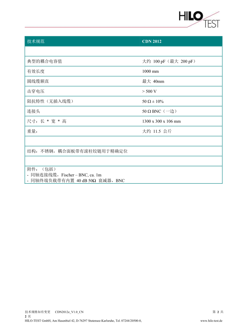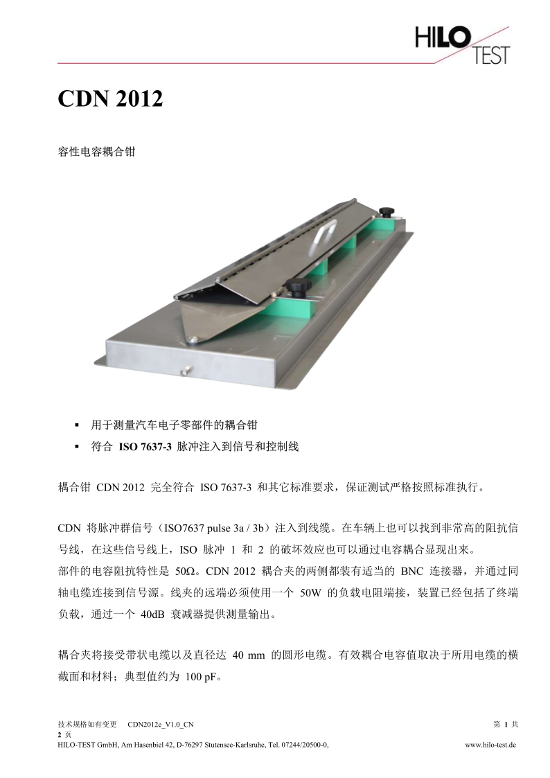 耦合钳 CDN 2012 完全符合 ISO 7637-3 和其它标准要求,保证测试严格按照标准执行。 CDN 将脉冲群信号(ISO7637 pulse 3a / 3b)注入到线缆。在车辆上也可以找到非常高的阻抗信号线,在这些信号线上,ISO 脉冲 1 和 2 的破坏效应也可以通过电容耦合显现出来。部件的电容阻抗特性是 50。CDN 2012 耦合夹的两侧都装有适当的 BNC 连接器,并通过同轴电缆连接到信号源。线夹的远端必须使用一个 50W 的负载电阻端接,装置已经包括了终端负载,通过一个 40dB 衰减器提供测量输出。 耦合夹将接受带状电缆以及直径达 40 mm 的圆形电缆。有效耦合电容值取决于所用电缆的横截面和材料;典型值约为 100 pF。